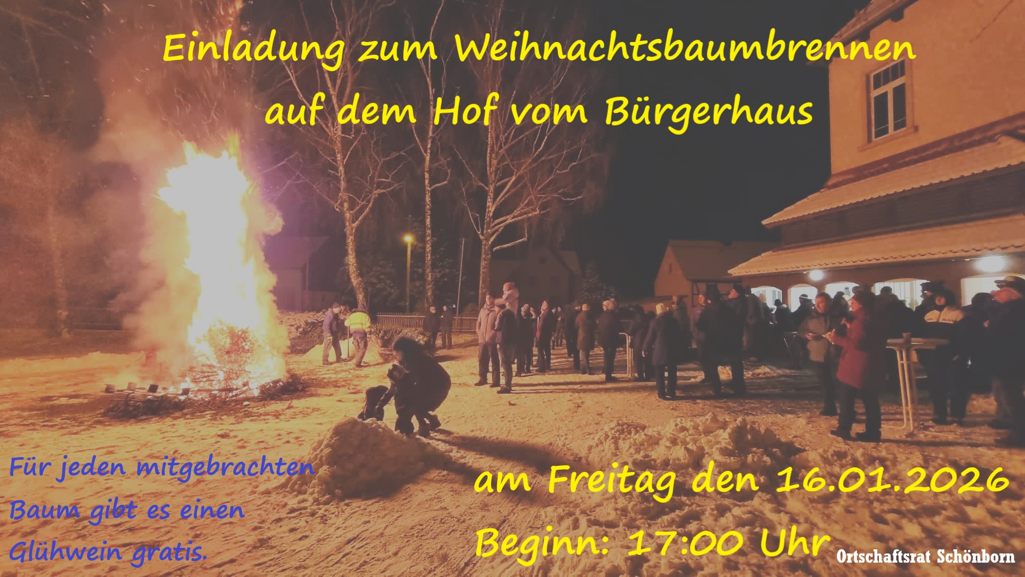 Read moreDer Ortschaftsrat Schönborn veranstaltet das alljährliche Weihnachtsbaumbrennen auf dem Hof vom Bürgerhaus am Freitag den 16.01.2026 ab 17:00 Uhr. Wie schon in den letzten Jahren gibt es für jeden mitgebrachten…