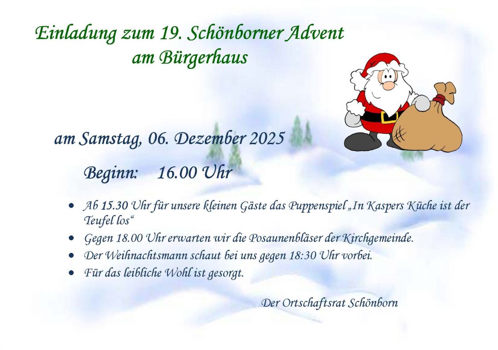 Der Ortschaftsrat Schönborn lädt zum traditionellen Jahresabschluss 2025 auf den Hof des Bürgerhauses Schönborn. Neben Puppentheater, Weihnachtsmann und Posaunenchor wird auch wieder für das leibliche Wohl durch den Ortschaftsrat gesorgt.